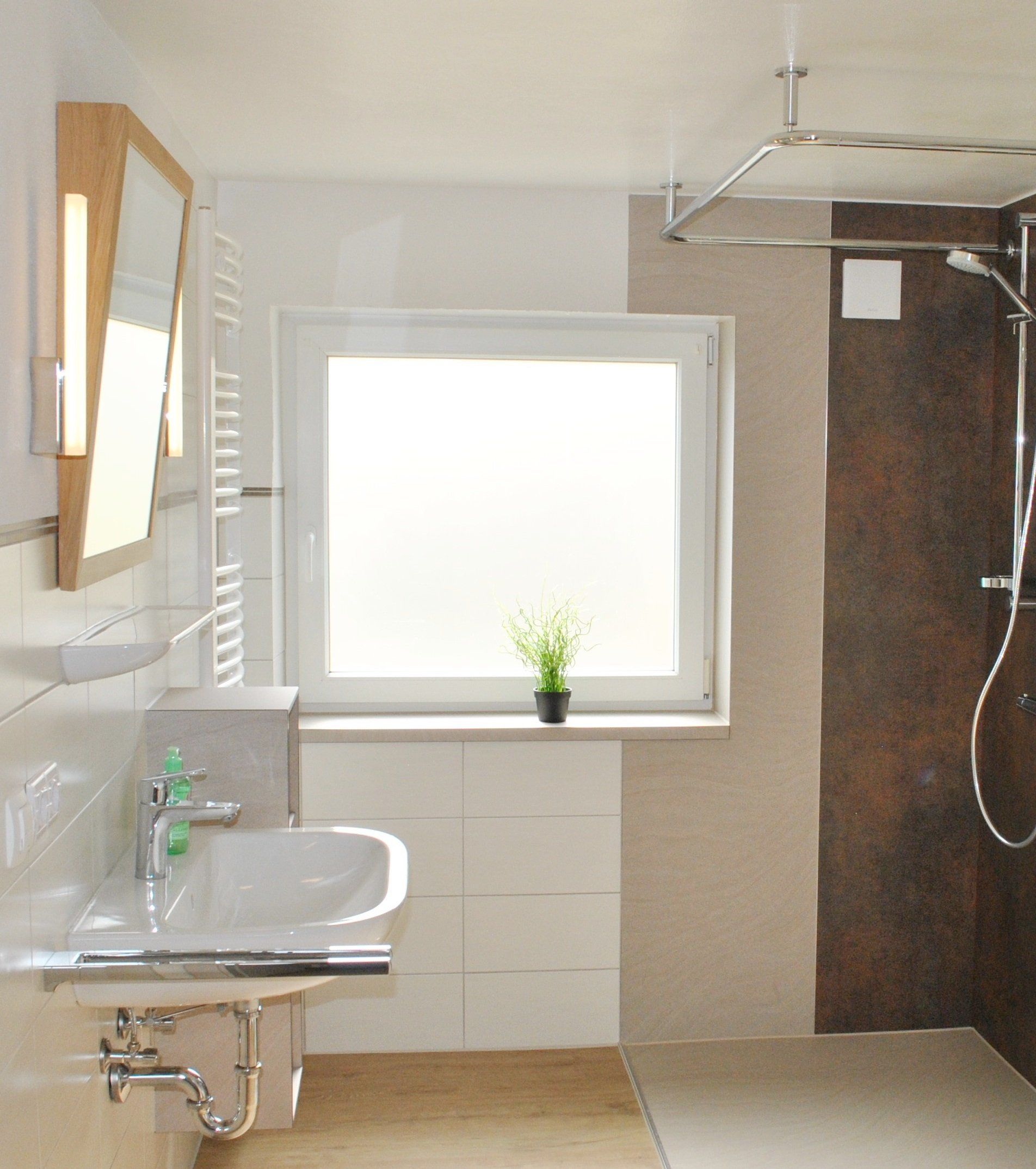 • Bathroom with walk-in shower and fold-out grab bars at the toilet