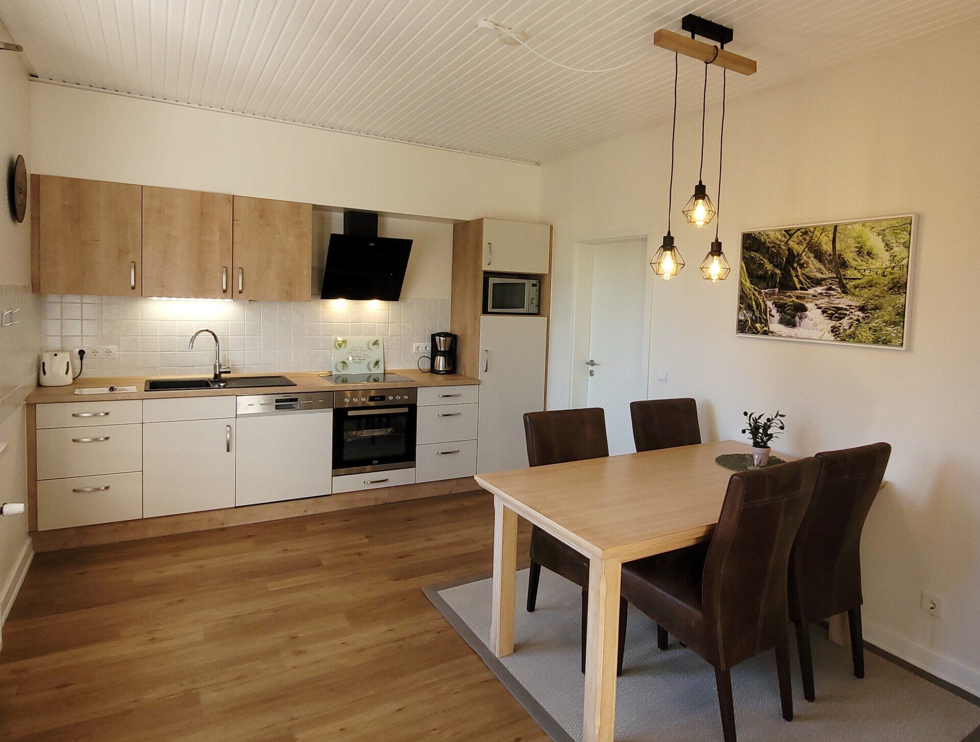 • Kitchen with a dining area, dishwasher, microwave, coffee machine, kettle, toaster,